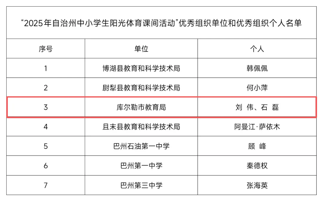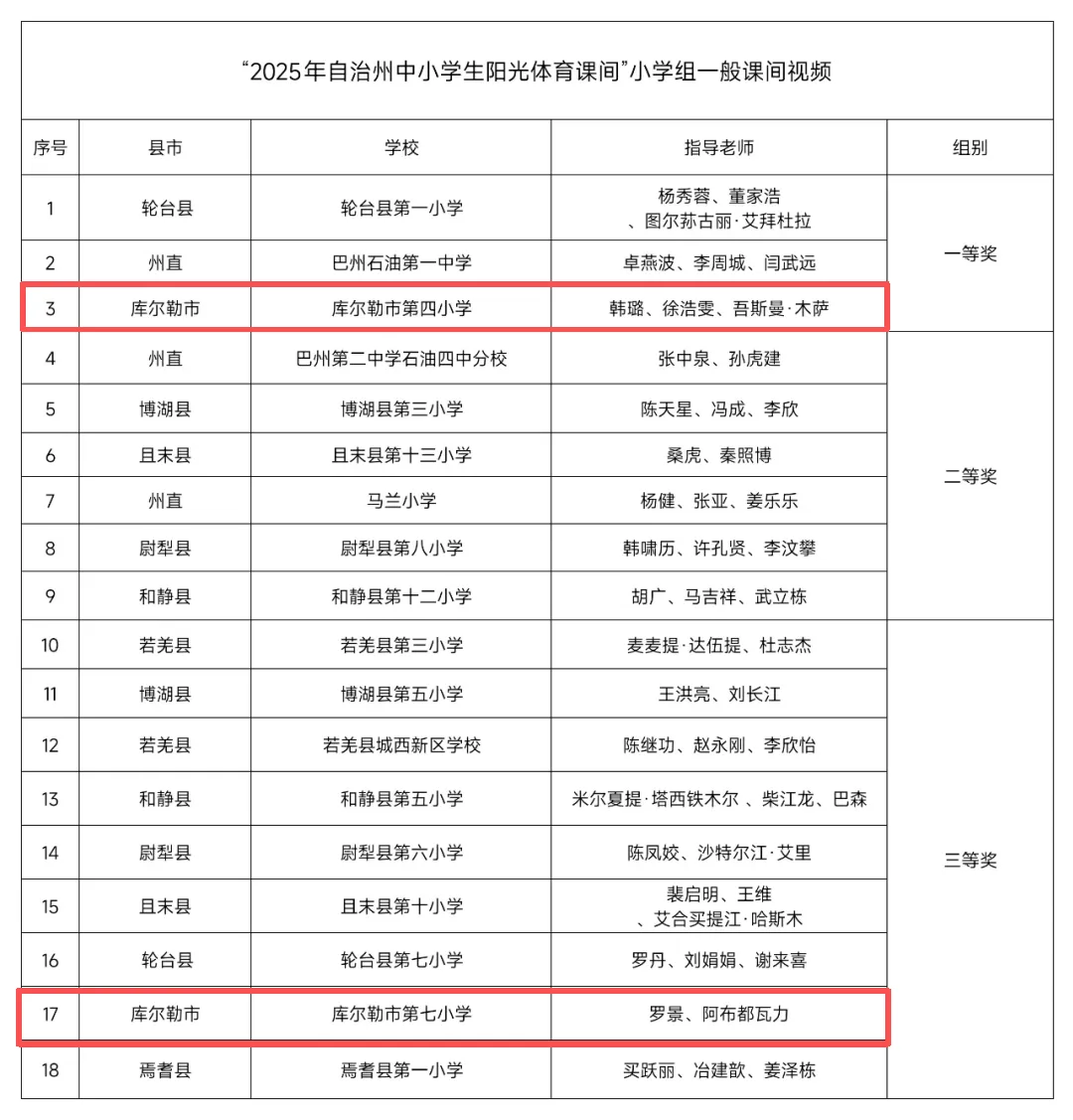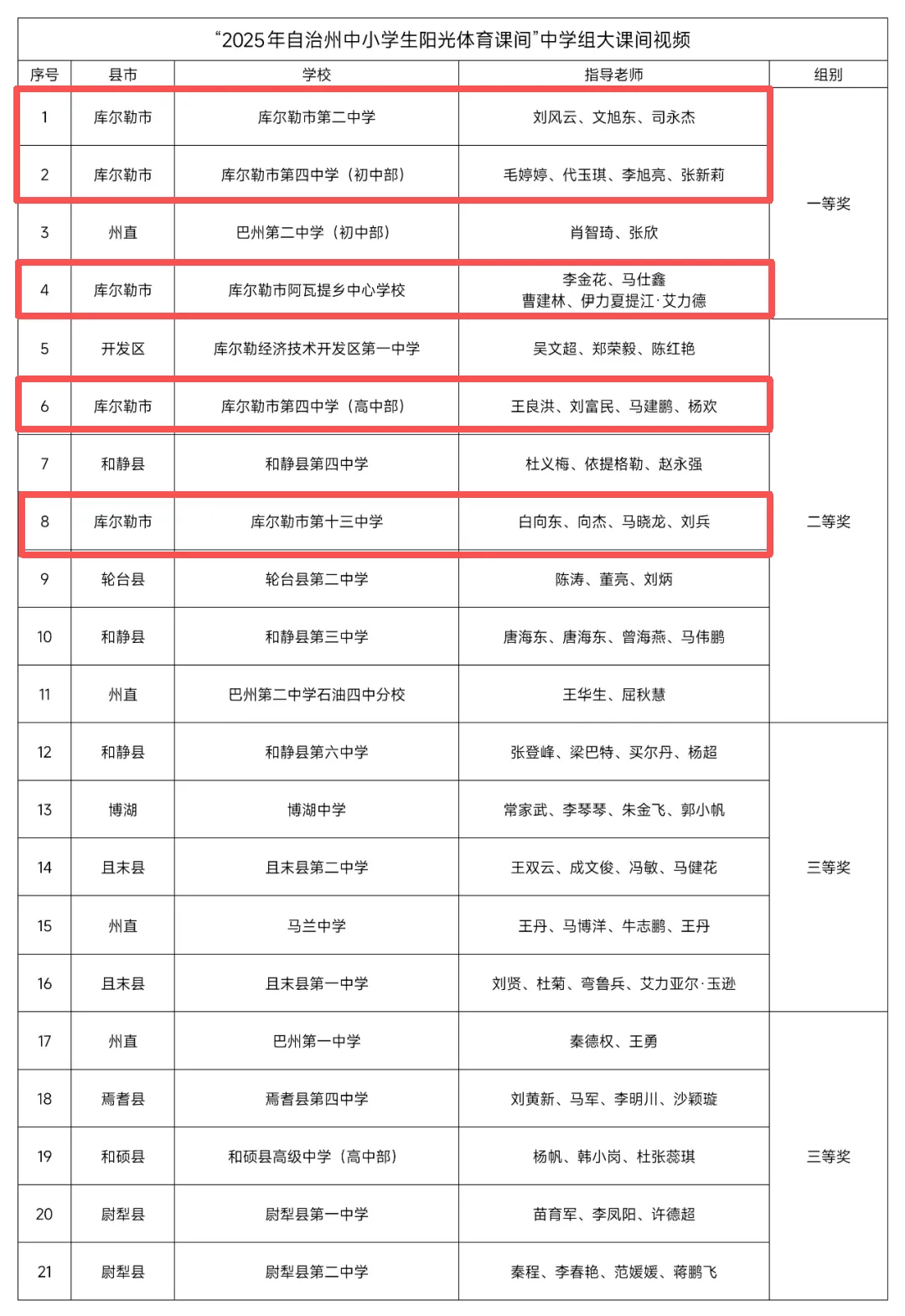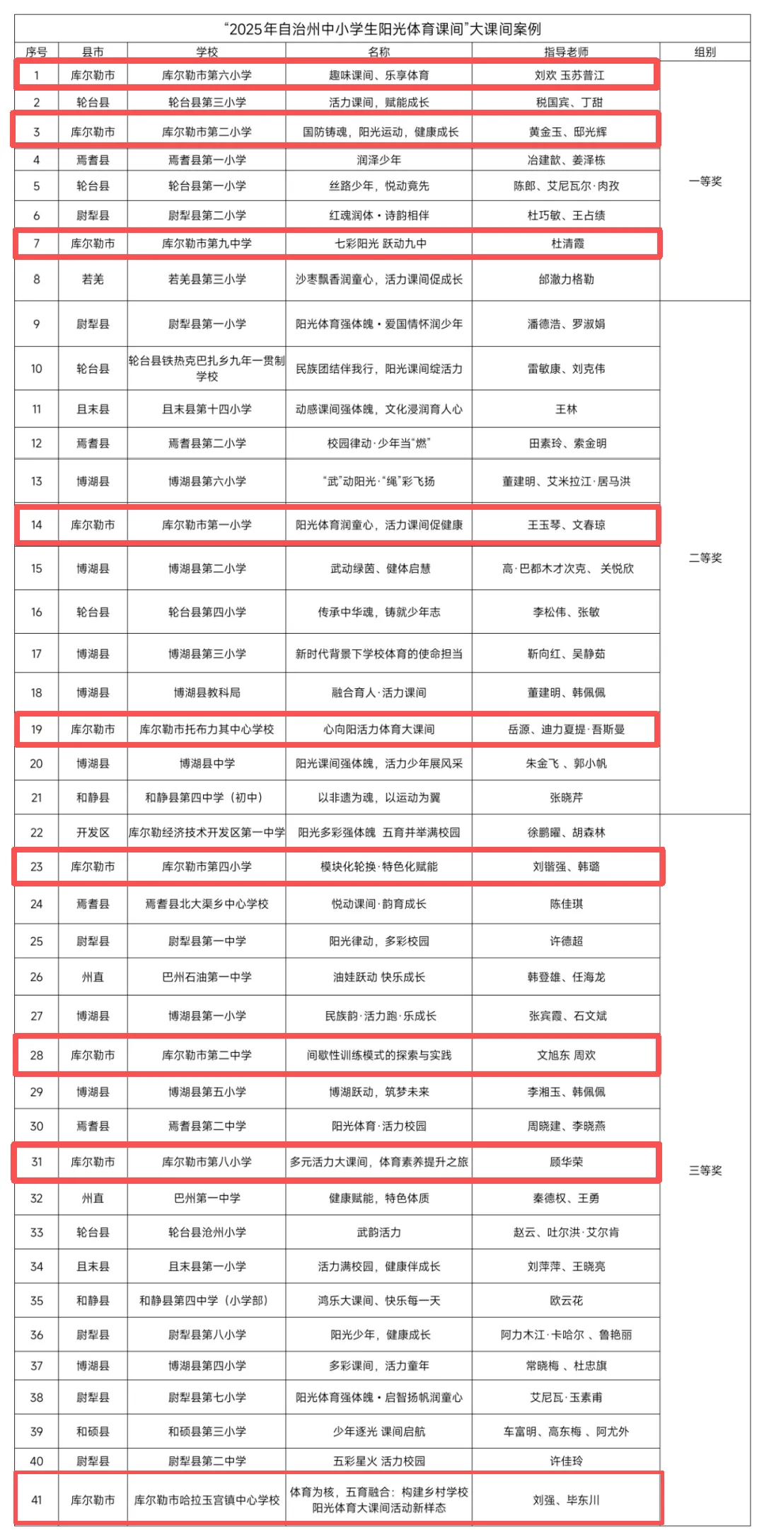 为深入贯彻落实国家、自治区《关于全面加强和改进新时代学校体育工作的意见》、自治区教育厅等四部门《关于印发〈自治区强化学校体育促进学生健康发展行动方案〉的通知》(新教厅〔2023〕103号)精神,丰富巴州中小学课间体育活动形式,全面提升中小学生体质健康水平,促进学生身心健康发展,2025年10月—12月,州教育局组织全州各中小学校开展“2025年自治州中小学阳光体育课间”评选活动。经各县市及州直中小学、各县市教科(育)局层层评选,共报送123个阳光体育课间视频作品及97个阳光课间案例参加州级评选,通过评审,最终有146个优秀作品在自治州级评审中获奖,其中,一等奖27个,二等奖47个,三等奖72个(详见附件1),评选出“优秀组织单位”7个,“优秀组织个人”8人(详见附件2)。