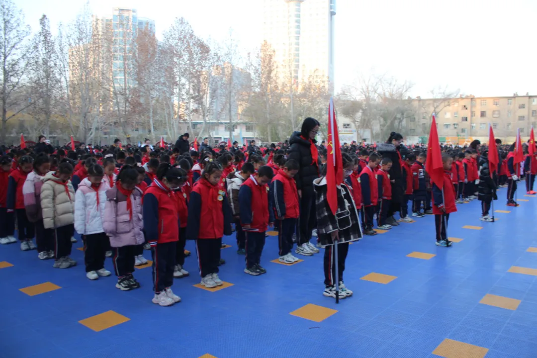 活动开始,两校操场同步举行升国旗仪式,嘹亮的国歌声中,鲜艳的五星红旗在库尔勒市与石家庄市的校园上空飘扬。随后,库尔勒市第二小学代表带来朗诵《跨越千里的铭记》,宣读《国家公祭日祭文》,字字恳切、句句沉痛。全体师生肃立默哀,表达对革命先辈的深切缅怀。