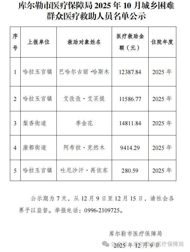 库尔勒市医疗保障局2025年10月城乡困难群众医疗救助人员名单公示