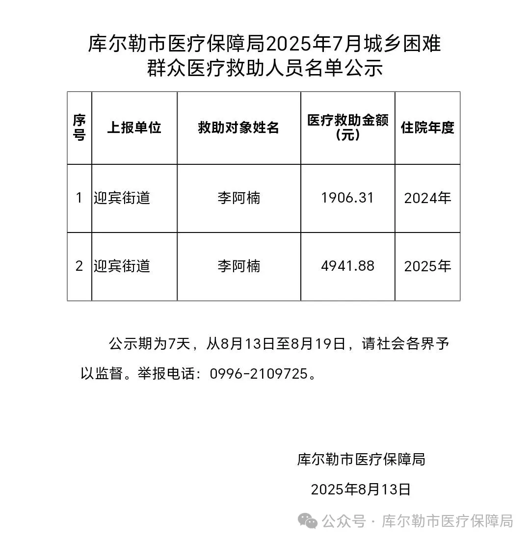 库尔勒市医疗保障局2025年7月城乡困难群众医疗救助人员名单公示