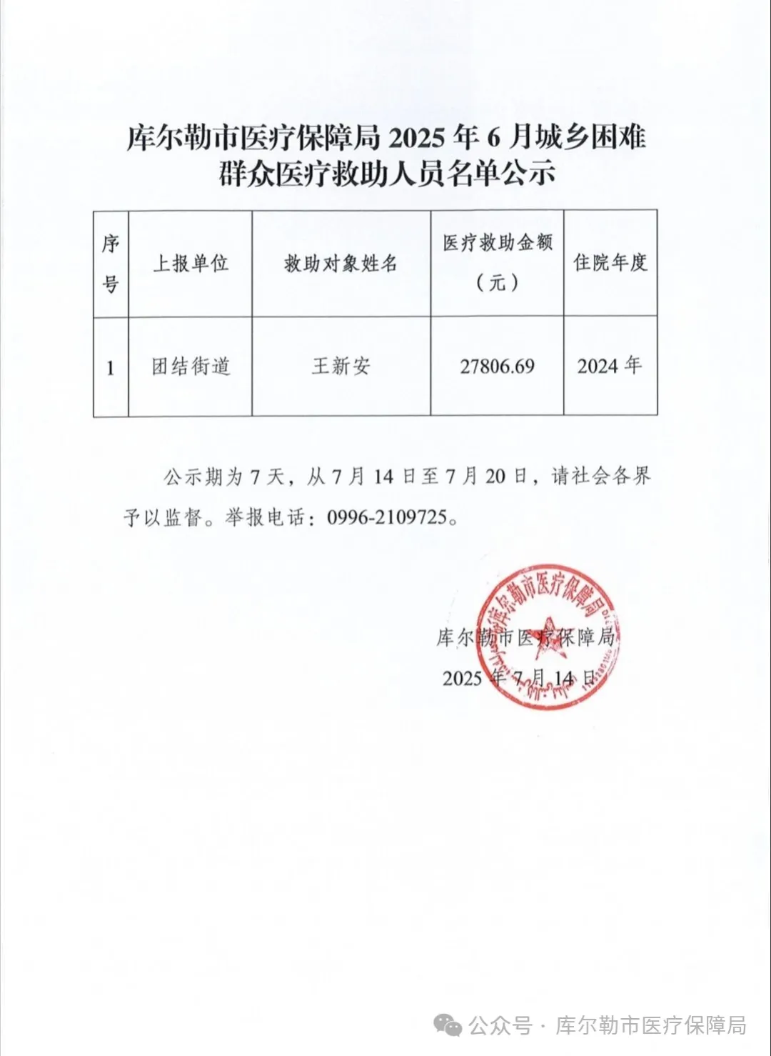 库尔勒市医疗保障局2025年6月城乡困难群众医疗救助人员名单公示