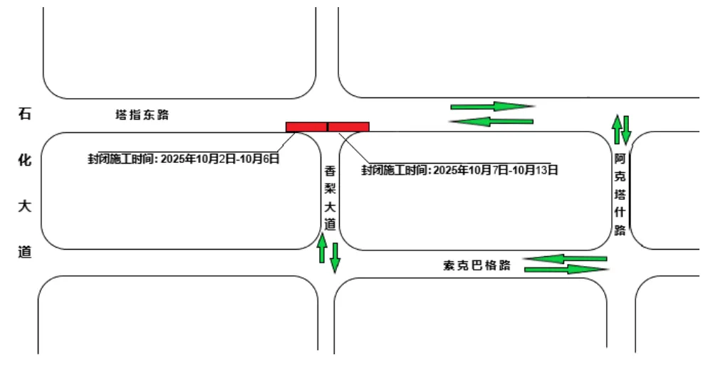 为保障库尔勒市燃气管道老化更新改造项目工程顺利施工,我公司计划对塔指东路与香梨大道交叉口依次封闭施工,预计封路时间为2025年10月2日21:00至2025年10月15日00:00。为确保您的出行安全及工程建设顺利进行,请途经至此路段的广大市民及车辆减速慢行或绕行,注意安全!感谢您对道路施工的理解与支持。