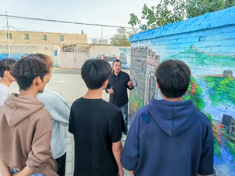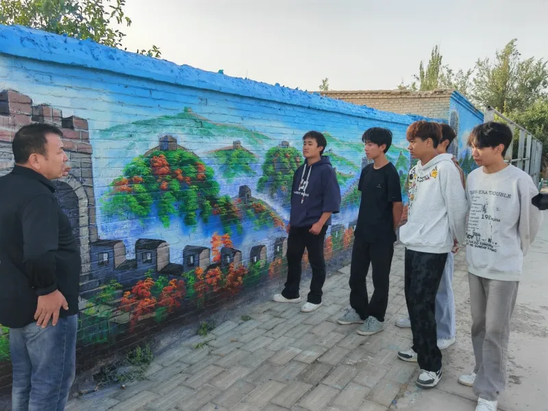 回到库尔勒后,吾甫选定上阔什巴格村村委会墙面作为创作地点,决心搭建一座连接边疆与首都的“精神桥梁”。创作中,他既刻画砖石的细腻纹路,又展现长城蜿蜒群山的磅礴气势。他的家人、返乡大学生和村干部们深受感染,自发组成志愿队,调颜料、搬工具,共同完成了这幅凝聚深情的作品。