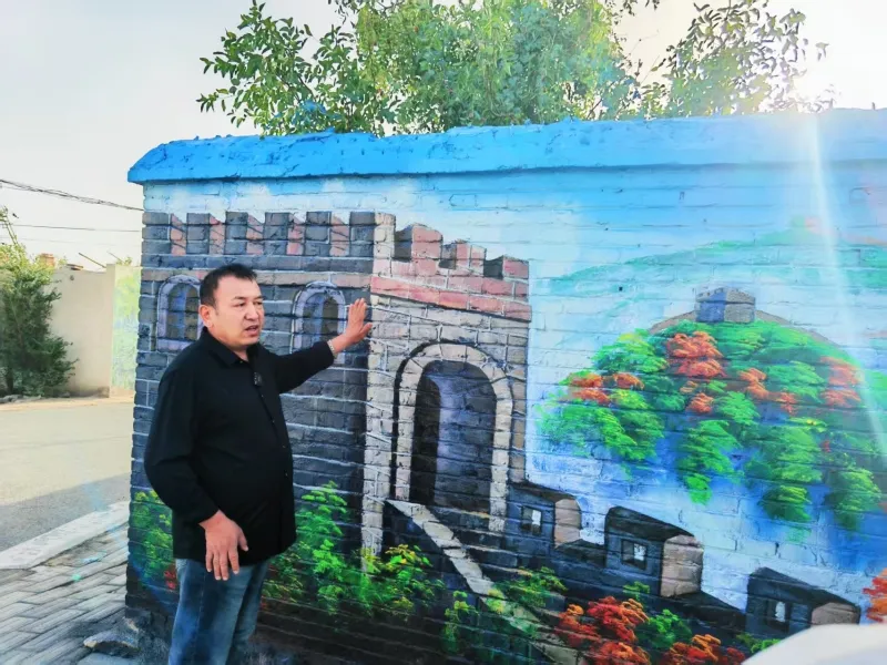 “我把万里长城画在家乡的墙上,就是想让村民和孩子们抬头就能看见这绵延起伏的长城,把对祖国的热爱刻在心里。”创作者吾甫·加帕尔身兼数职——他既是恰尔巴格村干部,也是库尔勒市美术家协会副主席、巴州文联全委会委员。扎根巴州文艺土壤的他,从9月8日开始,用一周时间让万里长城“绘”进村民心坎,更以画笔诉说对新疆维吾尔自治区成立70周年的真挚祝福。