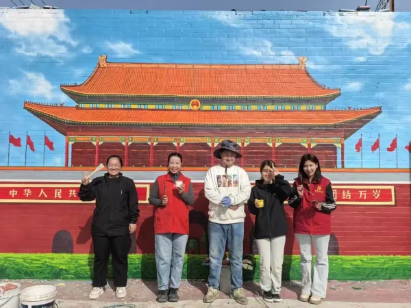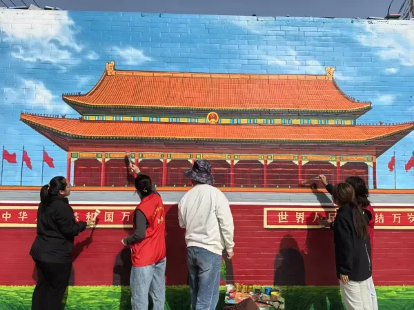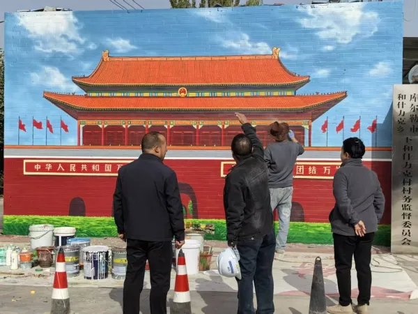与此同时,和什力克乡下和什力克村、萨依力克村也迎来文化盛事,村里邀请专业美术团队绘制巨幅天安门墙绘。团队提前了解村民喜好,结合乡村风貌设计底稿。施工时,村民在现场观摩,有人递颜料、有人扶梯子,从勾线到填色,每一笔都饱含着各族群众对家乡的热爱和祝福祖国更加美好的热切期盼。
