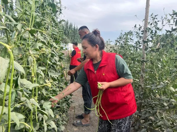 志愿者深入田间地头,帮助菜农摘豇豆,扎实开展“我为群众办实事”实践活动。