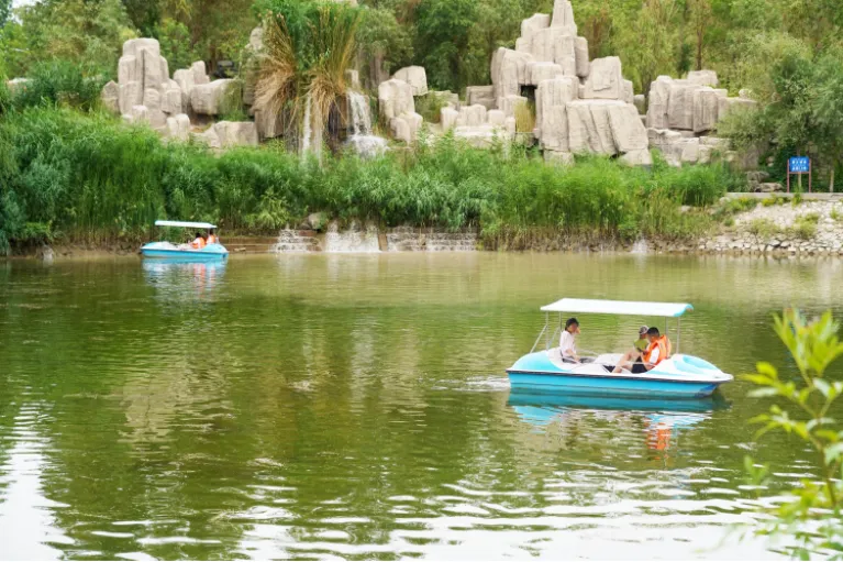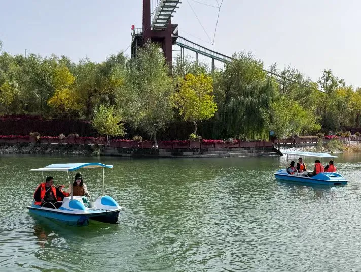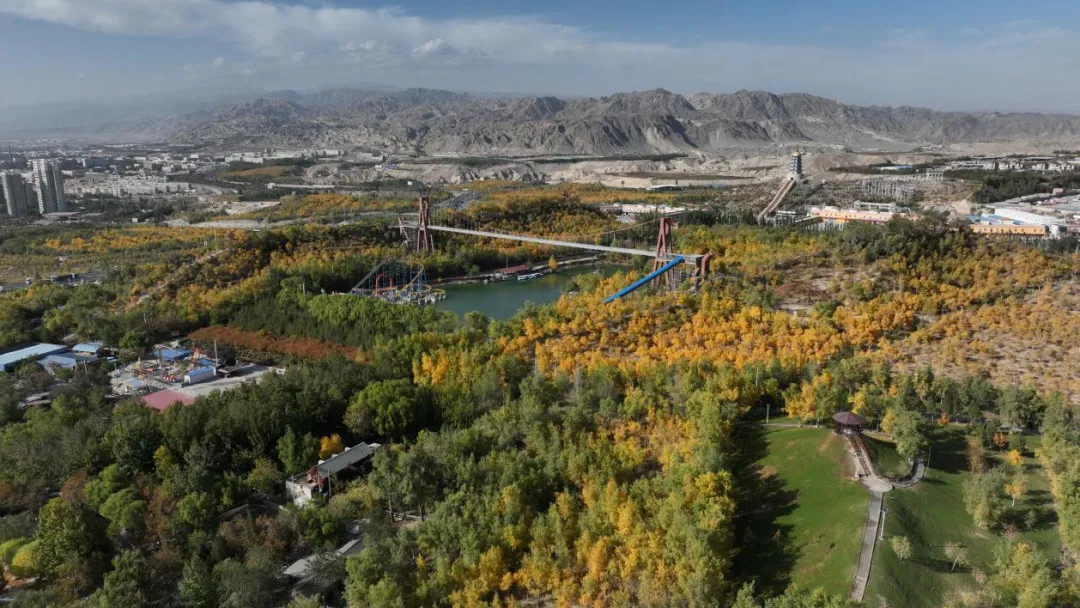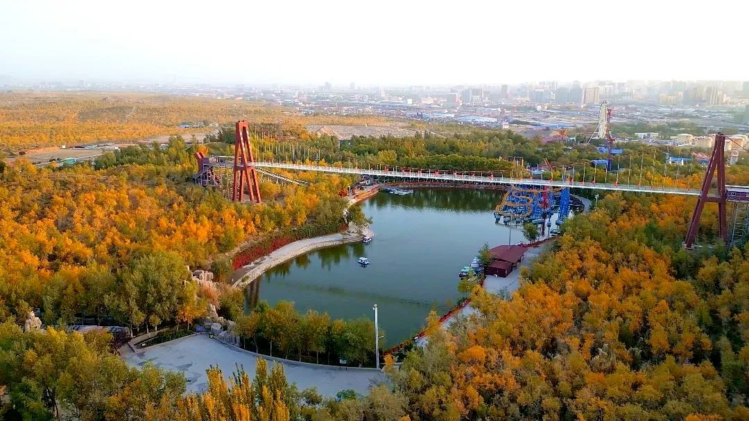 除了携家人漫步林间,还可以登上摩天轮,换个视角欣赏胡杨,随着座舱缓缓升高,整片胡杨林的壮阔全貌与远处的城市轮廓渐渐拼成一幅画,绝对能让你不虚此行。