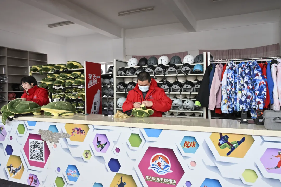 12月12日,走进龙之山东归滑雪场游客服务中心,现场一派忙碌景象。工作人员正细致整理各类滑雪装备,锃亮的滑雪板、安全头盔、色彩鲜艳的滑雪服等分门别类陈列在展柜,静候冰雪爱好者的到来,处处洋溢着即将开板的喜悦氛围。