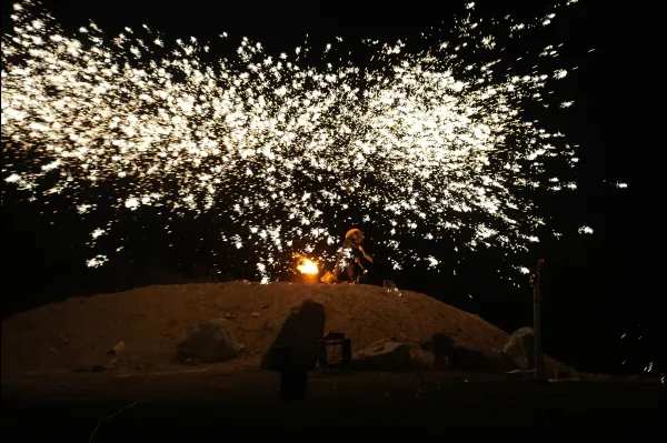 随着夜幕降临,璀璨的迎新烟花秀在铁门关上空绽放,绚丽的色彩与雄关的剪影交相辉映,构成一幅绚烂壮美的画卷。尤为引人注目的是打铁花表演,高温铁水在空中挥洒,形成“刚柔并济”的震撼效果,漫天飞舞的“铁花”在夜幕的映衬下格外夺目,为游客带来了一场难忘的视觉盛宴。