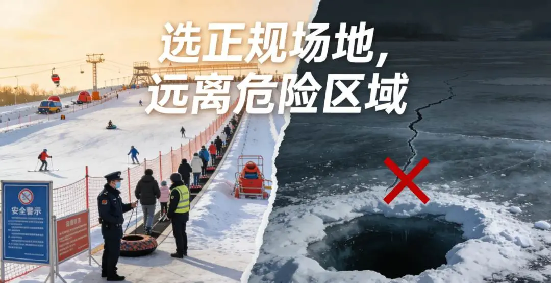 冰雪游玩,场地选择是安全的第一道防线。切勿前往未开发、无管理的野冰面、野雪区开展滑冰、玩雪等活动,自然冰面冰层厚度不均,积雪下可能暗藏冰裂、深坑,河道冰面还可能存在融冰隐患,极易引发落水、摔伤等意外。